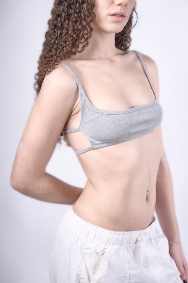Fotografías de un top, destacando claramente su forma, textura y detalles del tejido. Se trabajó con distintos ángulos y enfoques para que se pueda apreciar cómo se adiere la prenda sobre el cuerpo, sus acabados y la calidad del material, mostrando tanto la comodidad como la estética del top.