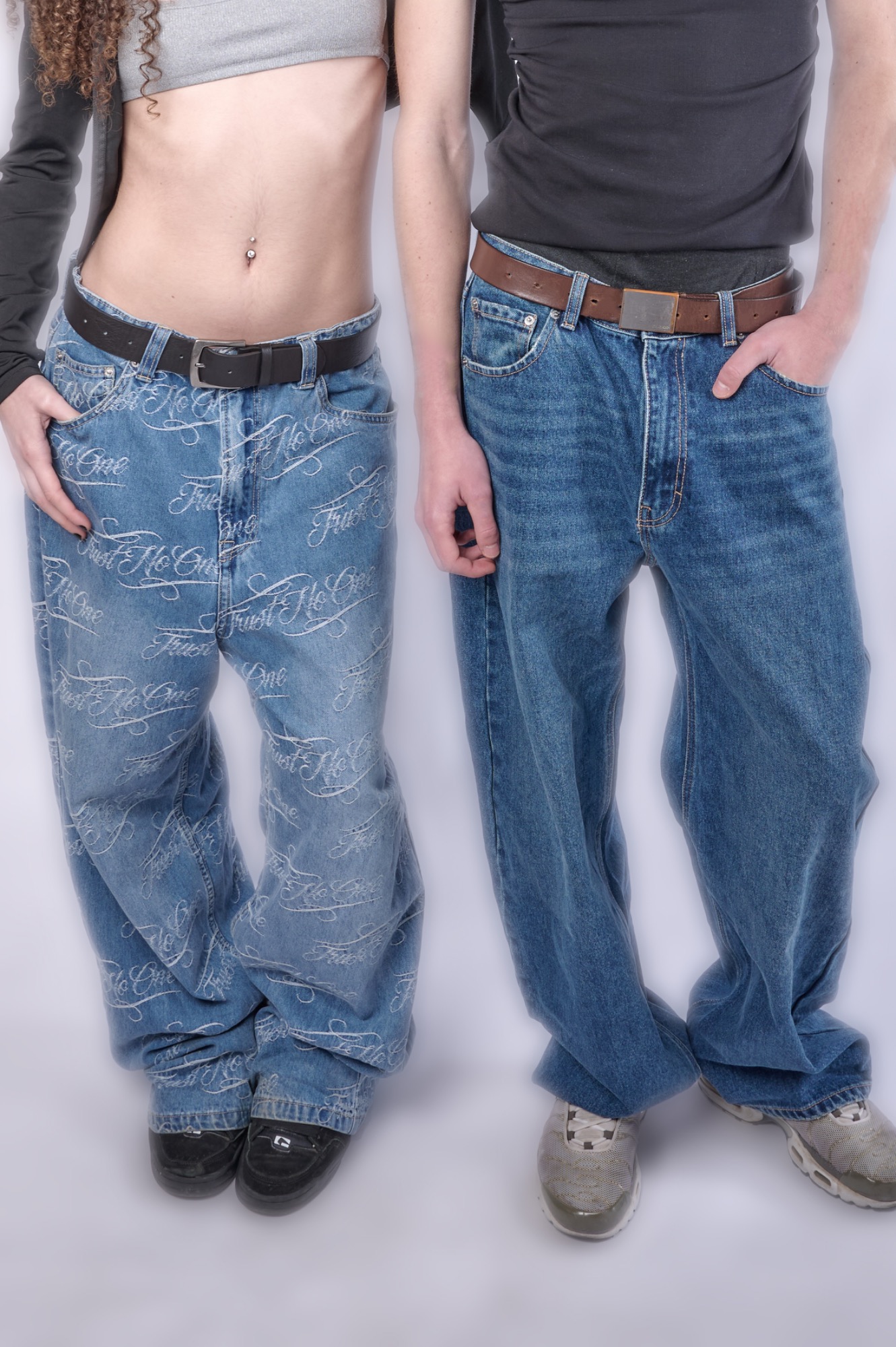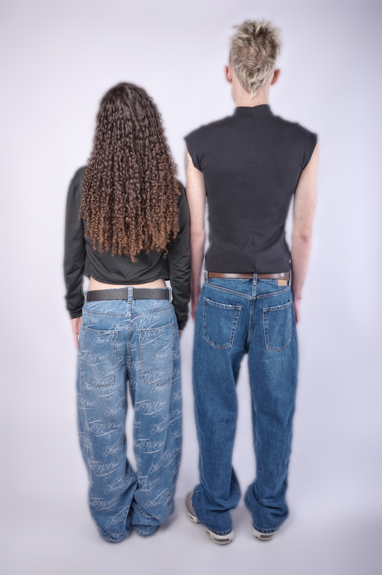 En estas imágenes se puede apreciar la chaqueta de ella y la camiseta de él, coordinadas en el mismo tono, junto con un cinturón atado en los pantalones que también combina con el conjunto. La serie muestra cómo las prendas se integran entre sí, resaltando la armonía de colores, estilos y detalles de cada pieza, y destacando al mismo tiempo el estilo propio de cada uno.